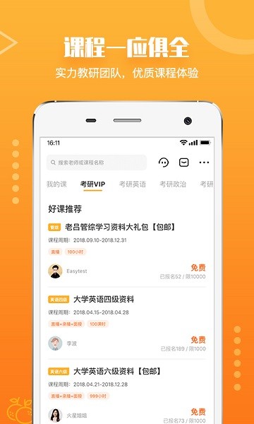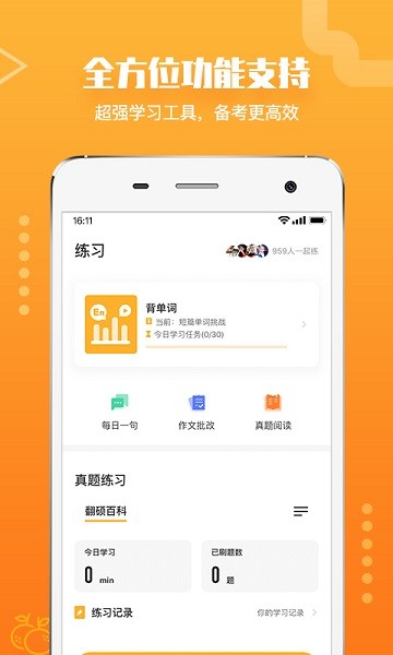 橙啦原力英语app是一款专为年轻人考研打造的学习服务软件,专注于打造大学英语四六级、考研、实用英语等优质在线直播课,并提供配套精品学习资料。直播+录播的授课形式,深入浅出的课程讲解,课堂氛围轻松愉快,另有专为学习开发的背单词小程序、院校库、真题库、在线批改等免费工具,从学习规划到知识吃透,还有配套的学习资料让你学习可以更加的轻松便捷,还有超多历年真题练习给你实训提什,快来下载试试吧!