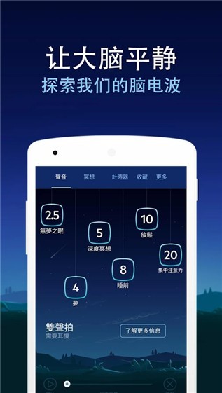 -- 52个动听的高品质环境声,包括2个用于脑波输送的双声拍频率。