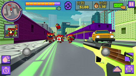玩家要扮演的是一个方块人,根据任务去消灭更多的方块人和汽车,不同的关卡不同的任务不同的场景,玩家可以自己选择射击视角,