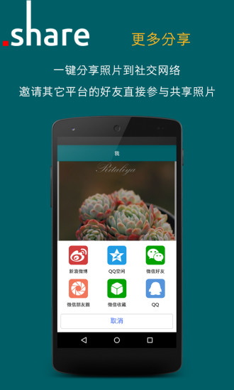 一键分享照片、相册或链接到微信、微博、QQ等社交网络,并可邀请其它平台的好友直接参与共享照片。