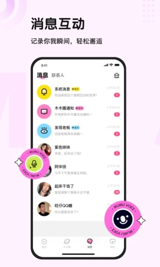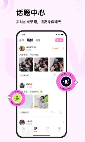 木木语音是一个深受年轻用户喜欢的语音交友社区。该平台内有着众多的交友方式,用户们可以在上面随时随地的结识朋友,并且还可以根据用户的需求去寻找,在这里能看到更多优质用户推荐,在线轻松认识兴趣相投的朋友,很高兴认识你,期待你的体验。用户们也可以在平台内找到自己的另一半,让缘分的你们在此相遇,有需要的朋友赶紧来下载吧!