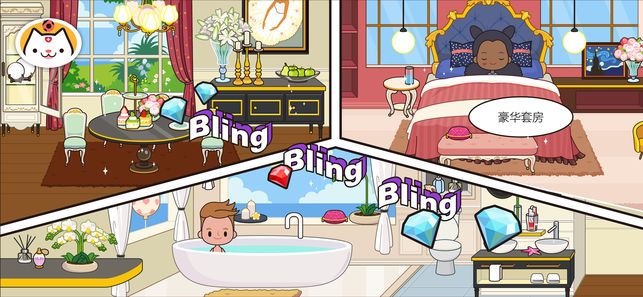 3、加米小镇之度假旅行游戏中房间中顶级的沐浴间,海景别墅和个性的服装。