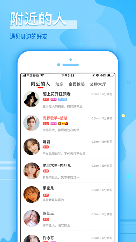 哩咔app是一款同城语音视频交友平台。超多声甜人美的小姐姐聊天室等你来撩,多人聊天室开放,K歌娱乐两不误,快来下载哩咔发现附近的好声音吧。