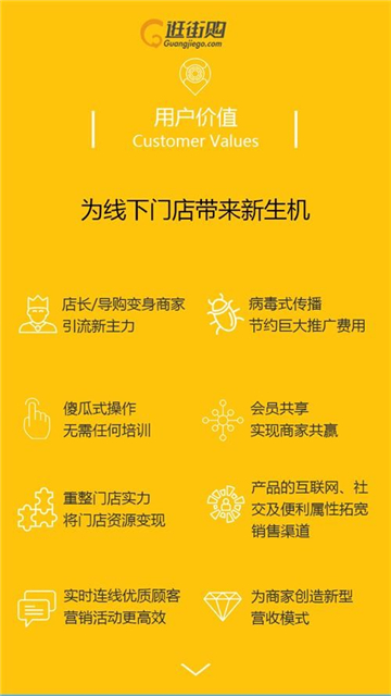 逛街购,服务于实体店,实现线上商品推展,策划线下促销,提升线下聚客能力。