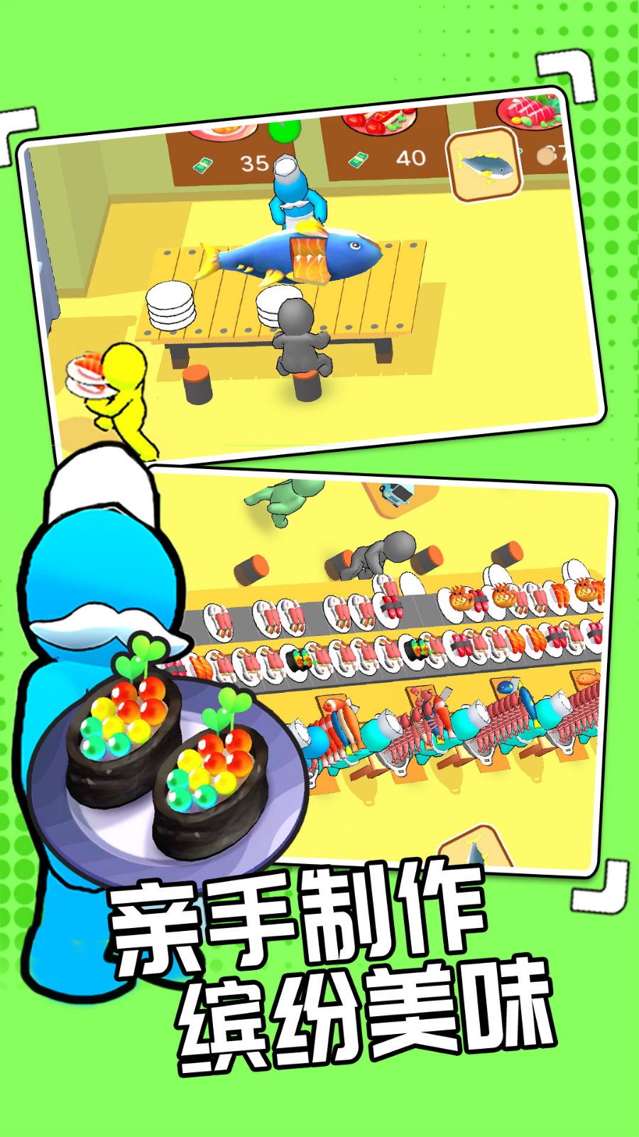 我的回转寿司app是一款卡通风格的回转寿司店模拟经营小游戏,在游戏中玩家将以不同的方式制作寿司,采购新鲜的食材制作不同种类的寿司满足吃货们的味蕾,快来下载我们一起变成寿司大师吧~