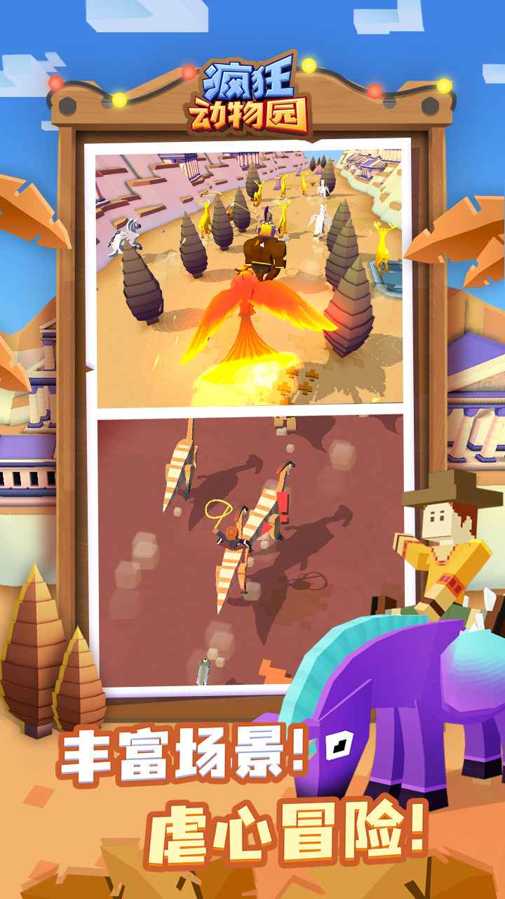 4、《疯狂动物园》是一款集3D像素、急速跑酷和模拟经营为一体的休闲小游戏。在游戏中你将扮演一名富有冒险精神的绝世牛仔。在高速移动的情况下与各种动物一较高下。你要尽可能多的套住动物,将它们统统带回飞船上的“空中动物园”中饲养;并进行园区升级,以便迎来世界各地的游客光临赚取更多金币。 Now,让我们去好好大干一场吧!
