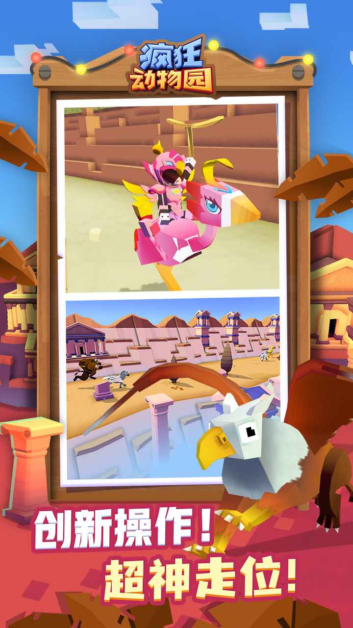《疯狂动物园》是一款集3D像素、急速跑酷和模拟养成为一体的休闲小游戏。在游戏中你将扮演一名富有冒险精神的绝世牛仔,在高速移动的情况下与各种动物一较高下。你要尽可能多的套住动物,将它们统统带回飞船上的“空中动物园”中饲养;并进行园区升级,以便迎来世界各地的游客光临赚取更多金币。