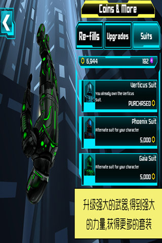 坠落侠的游戏模式整体感觉和跑酷类游戏差不多,只是该游戏是从天空往地底跑而已。游戏中可以收集的道具并不多,除了跟众多跑酷游戏一样可以收集方形的金币以外,还能收集紫色的能量珠。金币可以用来升级装备、购买新的服饰等,能量珠可以用来复活,这一点是比较有新意的,不然每次牺牲后都要重头再来,会很坑的。