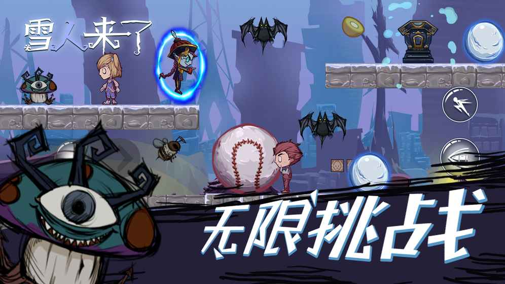 经典的雪人对战玩法,将雪球扔向敌人,将敌人变成大雪球,进攻鬼手;