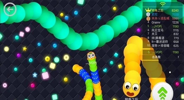 2、长按加速键,用巧妙的走位让蛇身被别人撞上,就可以吃掉他们啦;