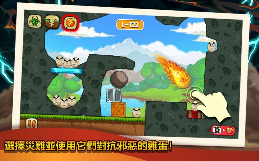 灾难将袭来是一款卡通风格闯关玩法的休闲益智游戏,在游戏中玩家们要制造各种灾难消灭关卡中的卵子,可以通过设计洪水、地震以及海啸,游戏里通过选择不同的灾难将关卡里的鸡蛋消灭,真实模拟各种物理要素,海量的场景关卡可供玩家挑战,玩家可以自由操纵自然灾害,例如飓风、地震、洪水等,你需要借助自然灾害来粉碎愤怒小蛋,完成最终挑战,感兴趣的玩家快快下载体验吧!