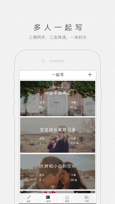 1.您可以邀请多人一起写作,制作情侣日常、亲子回忆、年会活动、毕业纪念册等把你们的经历做成书籍,让你们回忆留存的更加长久。
