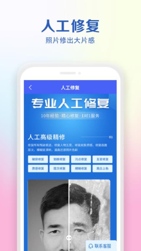 1. 修复功能:包括模糊、破损、划痕等老照片常见问题的修复。