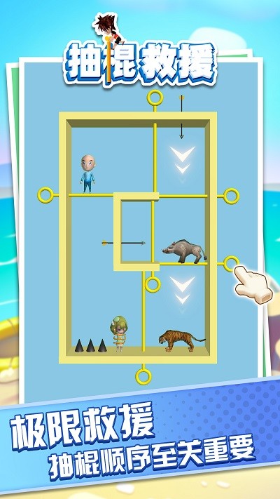 《抽棍救援》是一款非常有趣的物理类游戏,玩家需要运用策略和技巧,将纠缠在一起的棍子抽出一根或者多根,然后将其送到指定的位置。