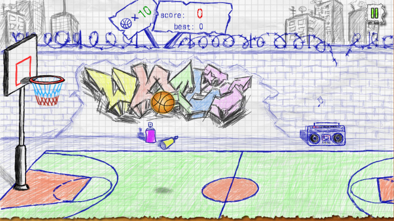 涂鸦篮球游戏它是涂鸦风格的投篮游戏,游戏里玩家既可以享受休闲游戏带来的快乐,又可以体验到命中篮筐带来的喜悦。玩家通过触屏来控制球的距离和弧线,投进篮就得分,越远分数越高。