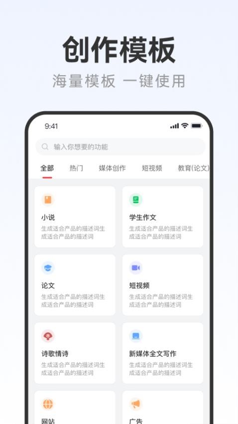 AI万能写作适用于各种写作场景,如学术论文、商业报告、新闻报道、小说创作等。用户只需输入关键词或主题,软件便能自动生成相应的文本内容,并支持用户根据需要进行修改、调整和完善。同时,AI万能写作还提供了一系列写作工具和模板,帮助用户更好地完成写作任务。