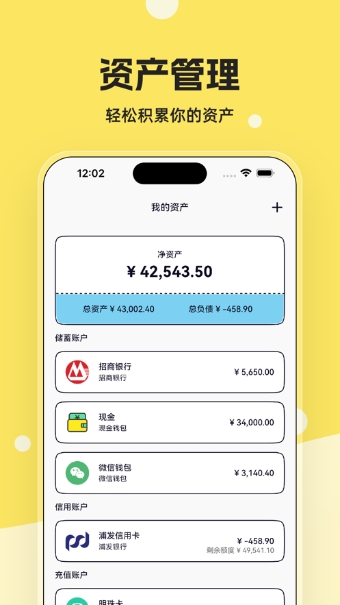 4. 资产管理:支持记录银行卡、信用卡、支付宝、微信等多种资产信息,方便用户统一管理个人资产。