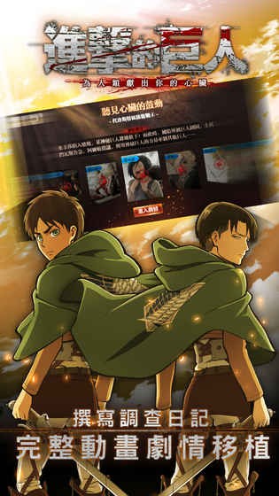 如果你喜欢《进击的巨人》这部动漫,那么这款《进击的巨人同人手游(AOTv2.0)》绝对不容错过。游戏以独特的视角和丰富的玩法,让你能够亲身体验到与巨人作战的刺激与乐趣。同时,游戏中还有丰富的剧情和任务等待你去探索和挑战。快来加入我们,与巨人展开一场生死搏斗吧!