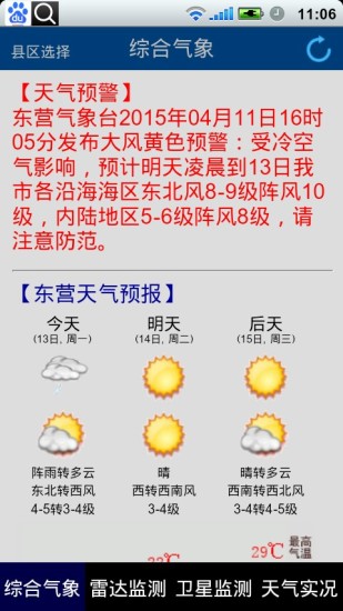 2. 气象预警:及时发布东营地区各类气象预警信息,如暴雨、大风、高温等。