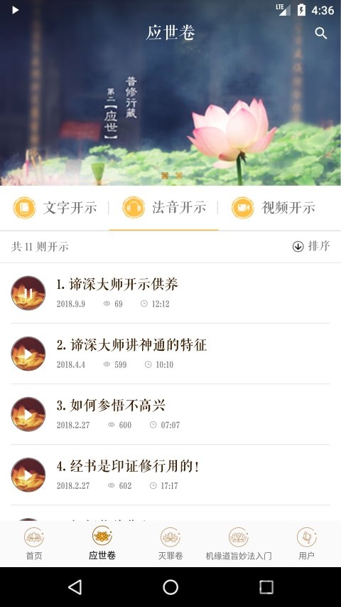 2. 修行指导:提供禅修课程、法师开示等修行指导内容,帮助用户提高修行水平。