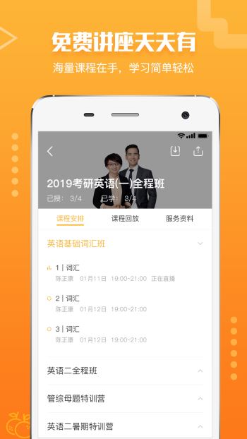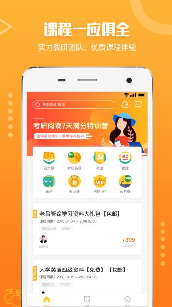 简介橙啦是一款大学生考试学习型APP,专注于考研、大学英语四六级等在线直播课程,并提供配套的优质学习资料。所有直播课均由行业名师亲自坐镇,历经数年教学经验打磨,涵盖所有必考知识点,为你提供高效、优质的备考课程。直播+录播的授课形式,深入浅出的课程讲解,课堂氛围轻松愉快。在这里,我们与万千学子共享成长的喜悦。下载橙啦,轻松学习,成功近在眼前!