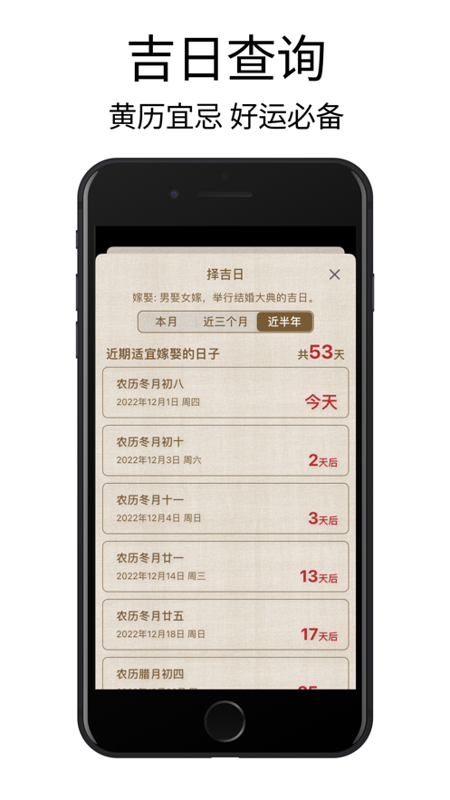 2. 在“黄历”页面,用户可以根据需要查询特定日期的黄历信息,如结婚、出行、开业等黄道吉日。