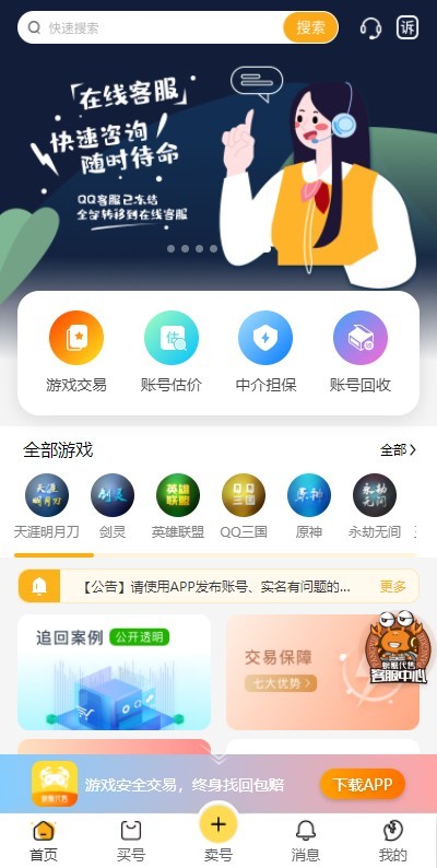 4. 提供交易安全保障,包括交易资金托管、账号找回保障等。