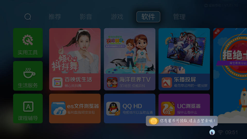 2. 打开蜜蜂市场TV,浏览推荐应用和热门榜单,发现更多精彩内容。