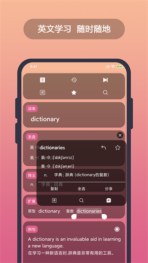 英汉随身词典是一款轻便且功能强大的移动应用程序,旨在帮助用户随时随地解决语言障碍。无论你是在学习、工作还是旅行,只需轻轻一触,即可获得准确的英汉互译和详细的词汇解释。