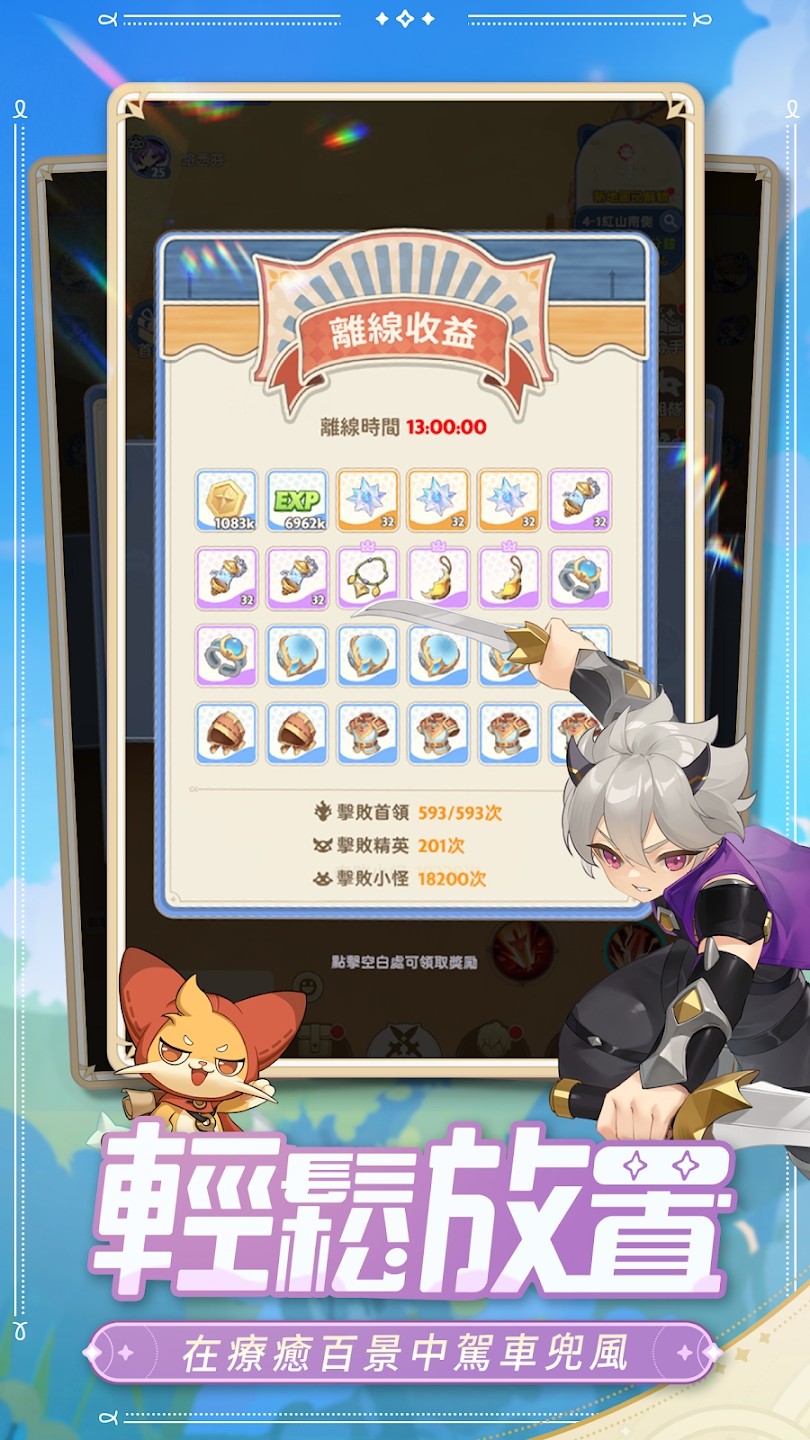 2. 放置战斗:游戏采用放置战斗的方式,让玩家在轻松休闲中享受战斗的乐趣。