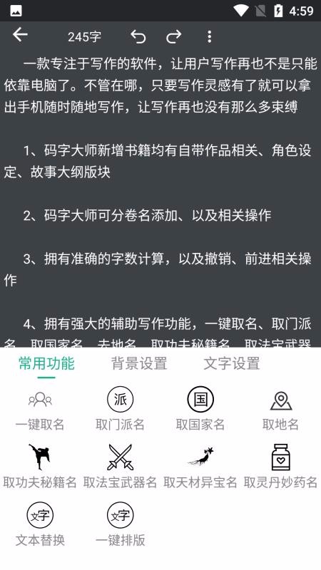 拥有强大的辅助写作功能,一键取名、取门派名、取国家名、去地名、取功夫秘籍名、取法宝武器名、取天材异宝名、取灵丹妙药名,以及批量关键字替换。