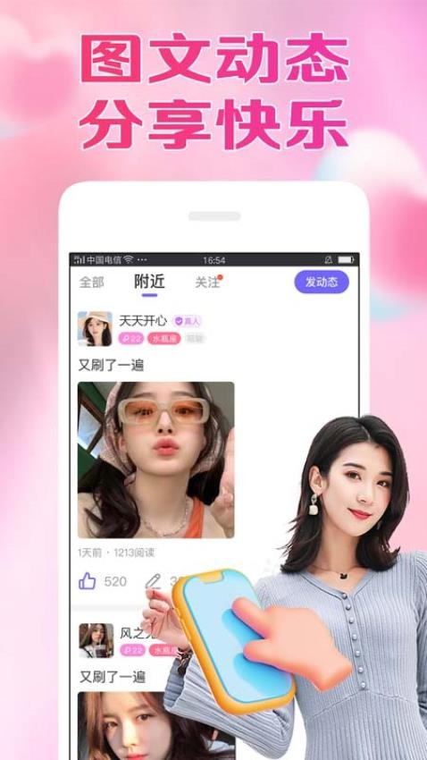 3. **动态广场**:用户可以发布自己的动态,分享生活点滴,浏览他人的动态,发现更多有趣的人和事。