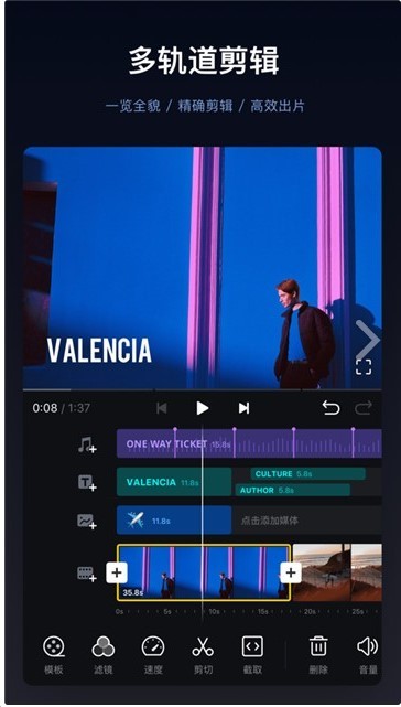 【快速剪辑】将PC端的剪辑轨道交互运用到【VN】中,指尖轻点即可轻松缩放素材,精确到秒选取需要剪切的关键帧。