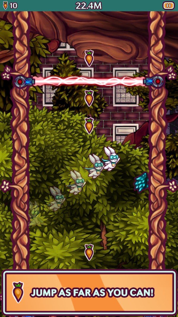 在游戏中,玩家需要帮助兔子收集胡萝卜作为能量来源,同时避开各种陷阱和障碍物,如激光、火箭等。随着游戏的进行,难度逐渐增加,玩家需要更加敏捷和迅速地反应,以攀登到更高的高度,刷新自己的记录。