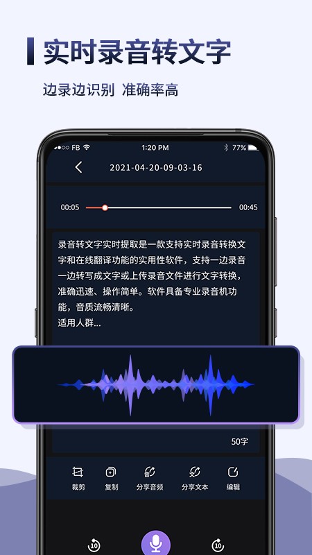 4. 实时转写:支持实时录音并即时转换为文字,方便用户实时记录重要信息。