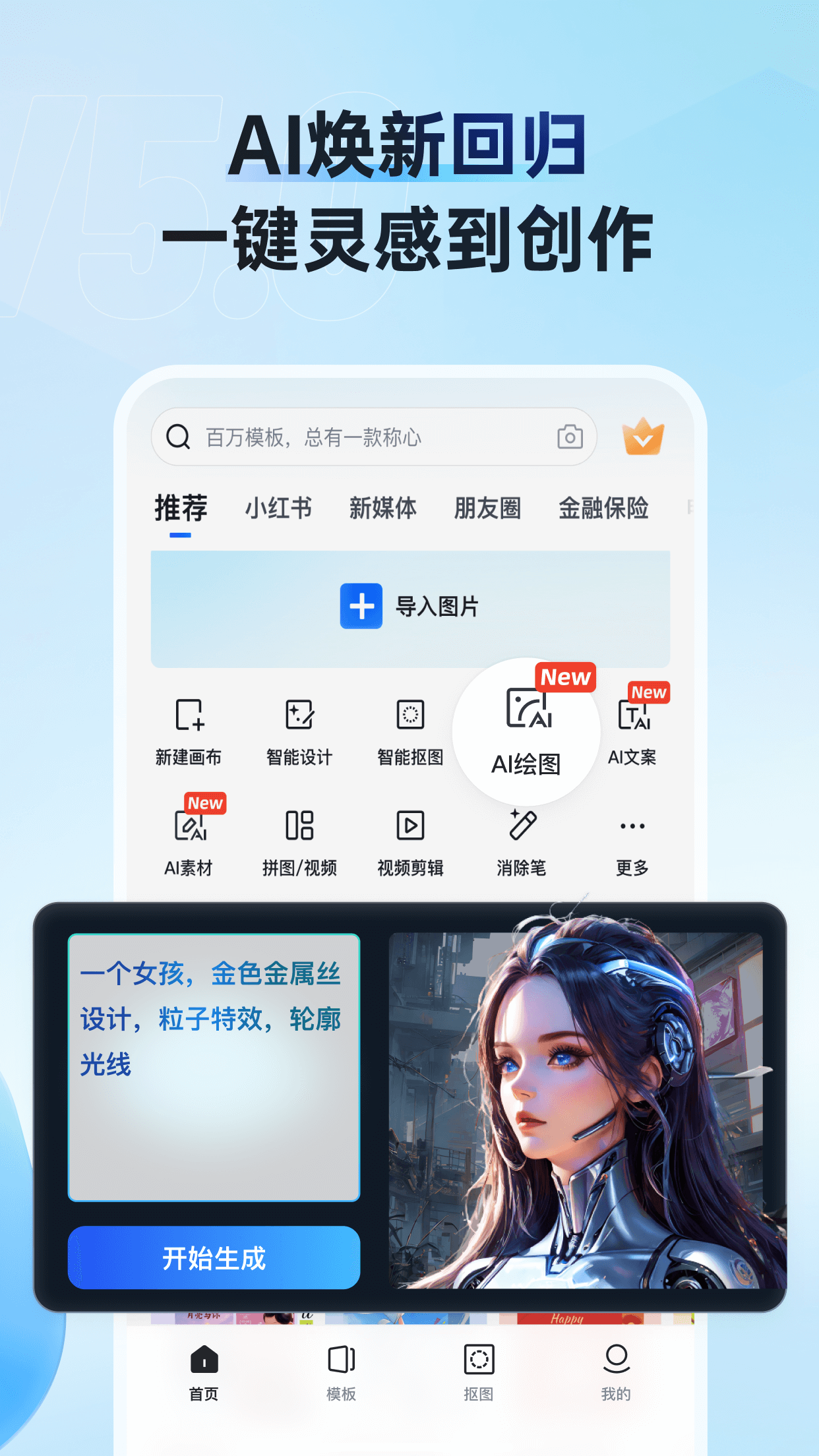 稿定设计最新版整合了海量的设计模板,涵盖海报、宣传单页、PPT、公众号图文、电商详情页等多种场景。用户只需通过简单的拖拽、替换文字等操作,即可轻松完成设计。此外,软件还提供了丰富的矢量图形、高清图片、字体等素材,满足用户多样化的设计需求。