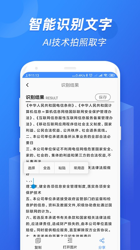 1. 文字识别提取:支持多种场景文字识别,包括扫描各种文件、图片、书籍、名片、手写字等,提取文字后可进行编辑、复制。