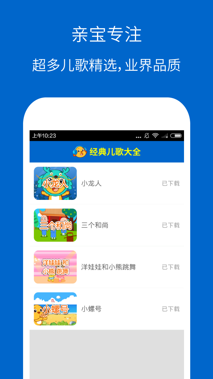 3. 歌曲下载:支持将喜欢的儿歌下载到本地,方便在没有网络的情况下播放。