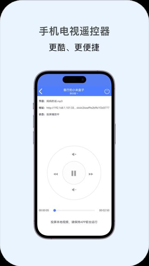 4. 个性化控制:内置遥控器功能,支持对投屏内容进行暂停、快进、音量调节等操作。