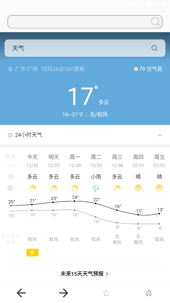 6. 天气查询:点击天气图标进入天气页面,查看实时天气和未来天气预报。