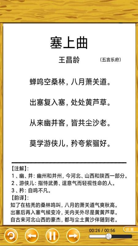 该软件精心收录了《唐诗三百首》中的经典诗作,覆盖了初唐、盛唐、中唐、晚唐等不同时期的代表作品。每首诗均配备有标准的普通话朗读,支持自动播放与手动翻页功能,用户可根据个人需求调节朗读速度、音量大小及背景音乐的开关,打造个性化的学习环境。