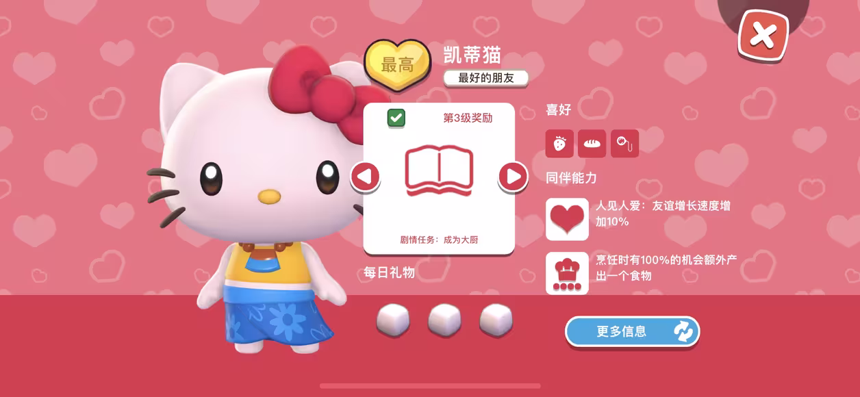 4. 角色互动:与Hello Kitty及其朋友们建立深厚的友谊,通过完成任务和互动解锁更多角色故事和特殊奖励。