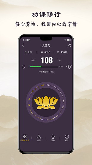 2. 实时统计:修行数据实时记录、统计并上传至云端,确保数据永不丢失。用户可随时查看修行时长、次数等详细数据,了解自己的修行进度。
