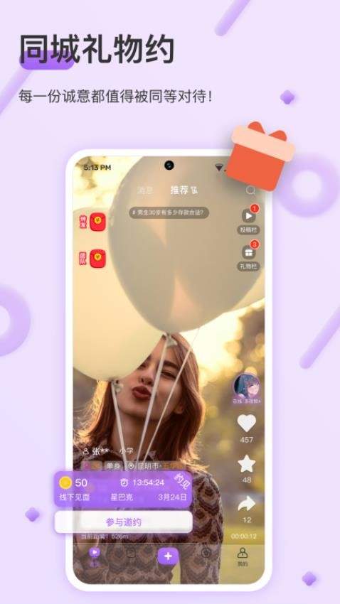 同城礼物约是一款专为都市单身青年及寻求社交乐趣的用户设计的创新应用。它结合了线上社交与线下活动的元素,通过精心策划的礼物交换与约会活动,帮助用户打破传统社交壁垒,发现同城中的新朋友和潜在伴侣。