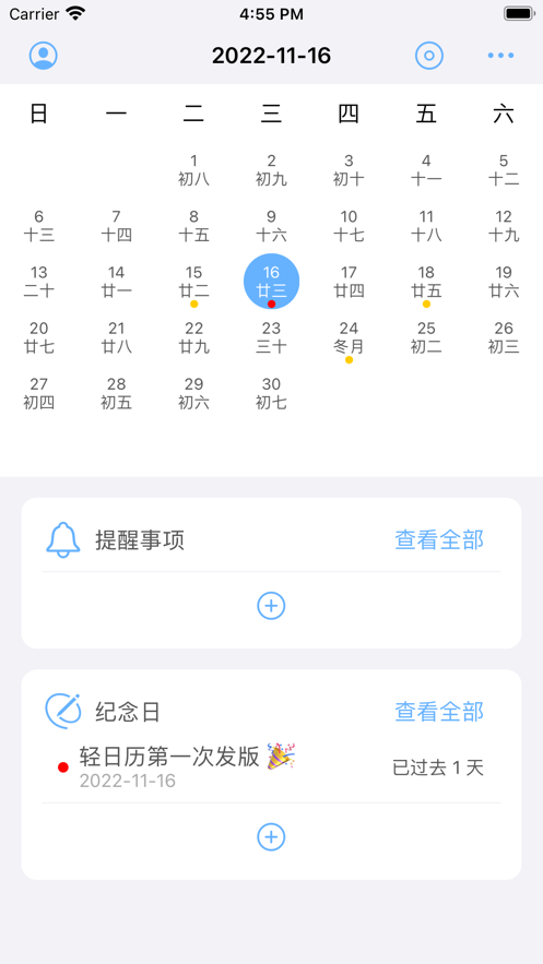 轻日历支持公历、农历及节假日查询,界面清新,操作流畅。它具备日程提醒、事件重复设置、日程分类管理等功能,让用户能够根据自己的需求灵活安排每一天。同时,软件内还集成了天气预报、星座运势等生活实用信息,为用户提供更加全面的服务。