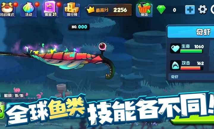 - 游戏中包含多种鱼类,每种鱼类都有其独特的技能和属性,如毒性皮肤、巨口吸引等。