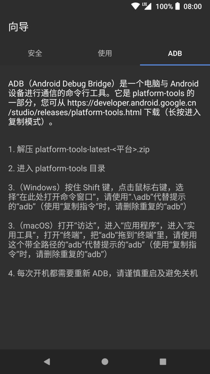 3. USB调试激活:首次使用或每次重启后,需要通过USB调试模式激活黑阈。用户需在电脑上安装ADB工具,并通过USB连接手机执行相关命令。
