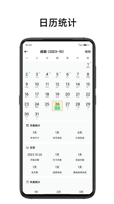 3. 数据统计与查看:提供历史统计数据,包括连续打卡天数、已打卡次数、未打卡次数等,帮助用户了解自己的打卡进展。