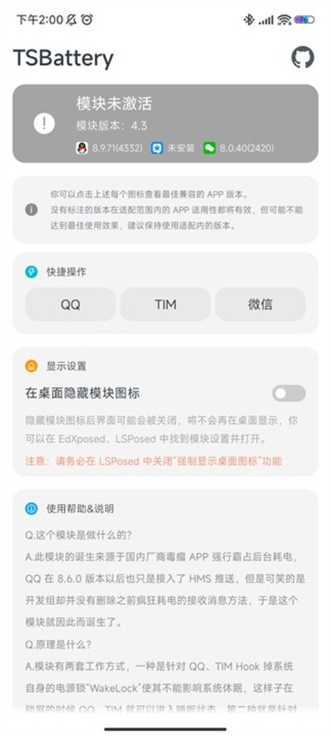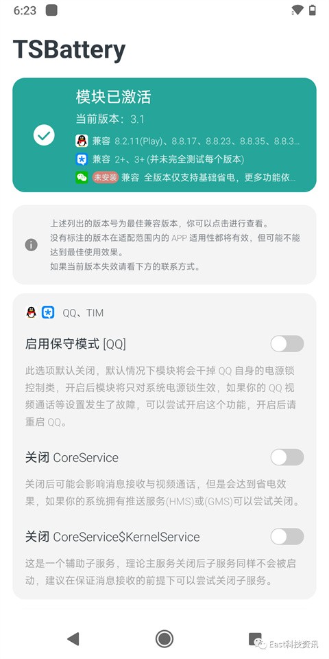 3. 开始使用:在激活并确认模块生效后,用户可以在微信、QQ和TIM应用中享受更低的电池消耗。同时,也可以在快捷操作里面直接打开这些应用。