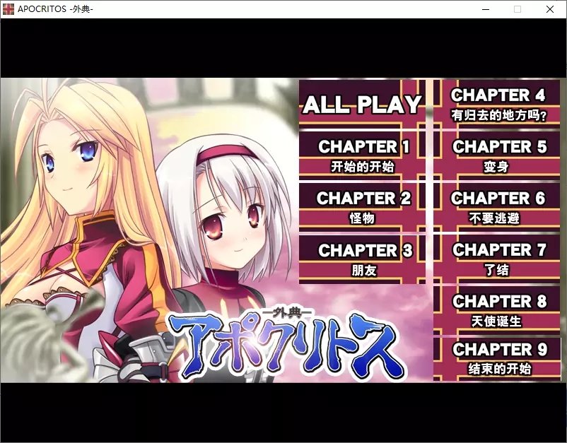 《APOCRITOS-外典-》是一款由日本WAVESTAR有限公司出品的百合题材恋爱冒险游戏,剧情融合了奇幻色彩与对战模式。故事背景设定在一个遥远的时代,天使的世代交替之际发生了异常,本应只存在一个天使之卵的情况下,却意外出现了两个卵,其中一个必须被打破,以保护人们的幸福。年轻的主护骑士“マグナ”偶然得知了这个秘密,她带着一个天使的卵逃离了骑士团,而她的好友兼另一名主护骑士“ルゥ”则紧随其后,两人的追逐战在东京展开,同时卷入了一个东京少女,故事由此深入发展。